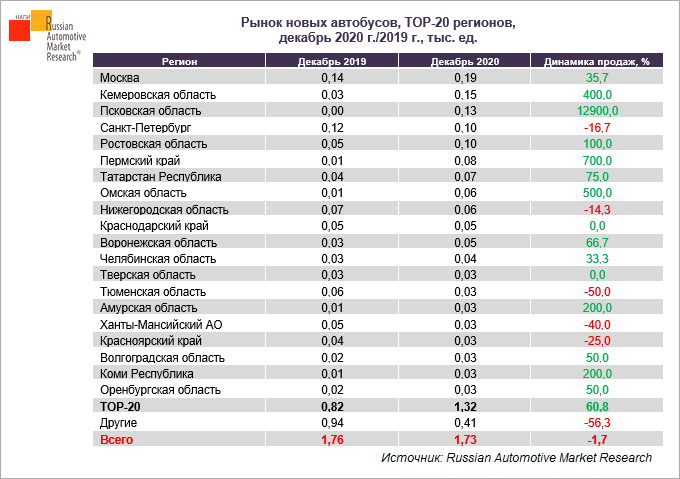 В декабре 2020 г. рейтинг регионов по продаже новых автобусов возглавили Москва, Кемеровская и Псковская области.