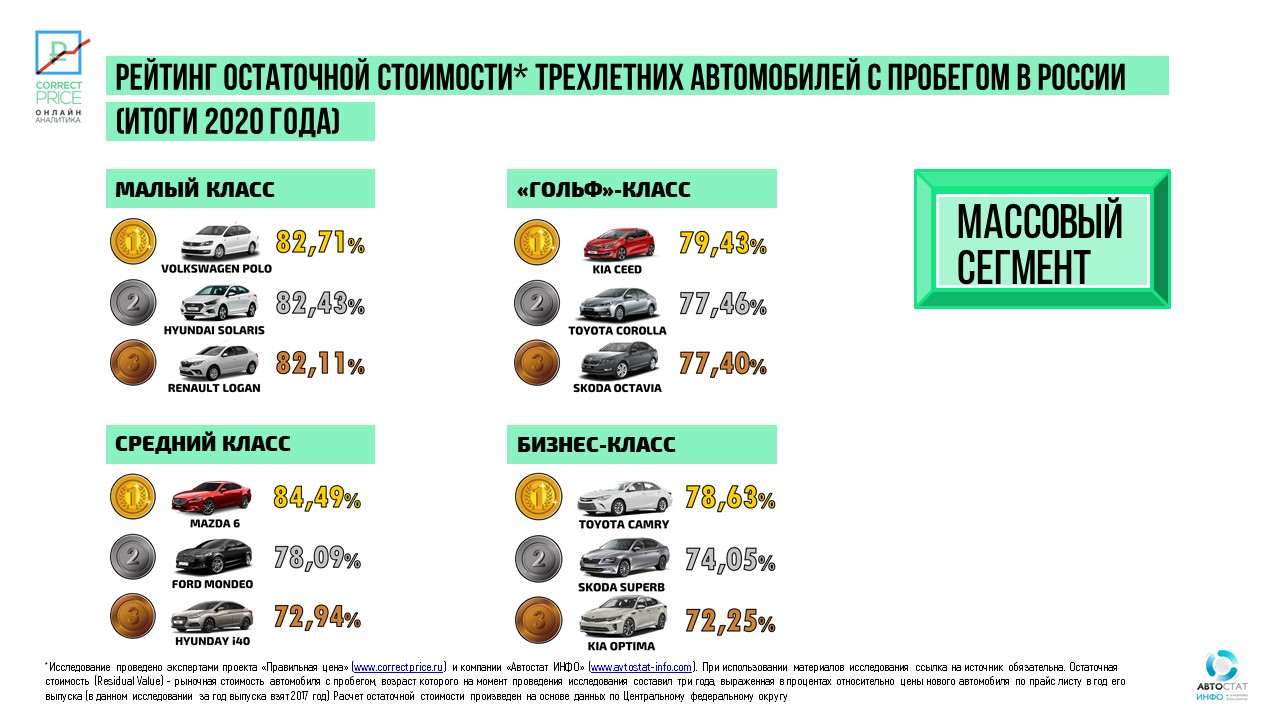 Анализ итогового рейтинга показывает, что самым ликвидным автомобилем в массовом сегменте является Hyundai Creta. За три года эксплуатации такой кроссовер сохраняет до 90,29% своей первоначальной стоимости.
