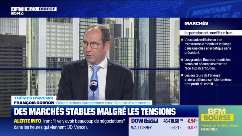 Ce mardi 7 avril, François Gobron, gérant actions européennes chez Generali Investments, s'est penché sur le changement de régime durable sur les marchés, la stratégie à adopter face à l'instabilité géopolitique, et l'importance stratégique de l'IA dans la crise géopolitique, dans l'émission BFM Bourse présentée par Antoine Larigaudrie. BFM Bourse est à voir ou écouter du lundi au vendredi sur BFM Business.