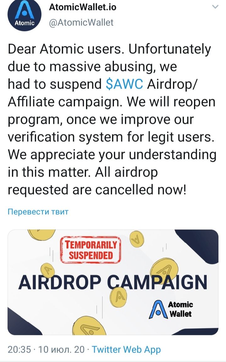 Плохие новости - не успел я рассказать о том, как круто можно зарабатывать с раздачей Atomic Wallet, как стало известно, что ее прикрыли.