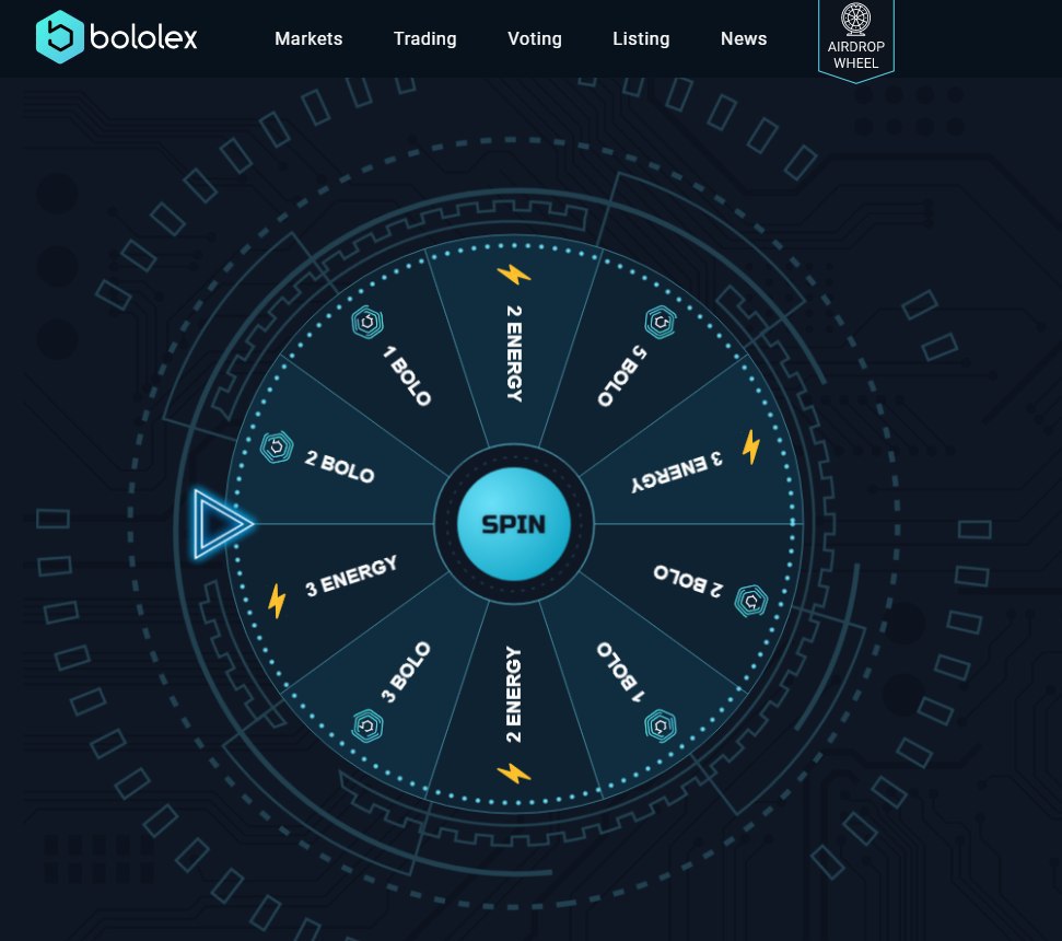 Криптобиржа Bololex раздаёт свои токены BOLO через колесо-рулетку. За каждое вращение можно получить до 5 монеток (~0.035$). На каждый спин тратится 3 единицы энергии. За час восстанавливается 1 единица, можно докупать энергию за BOLO.