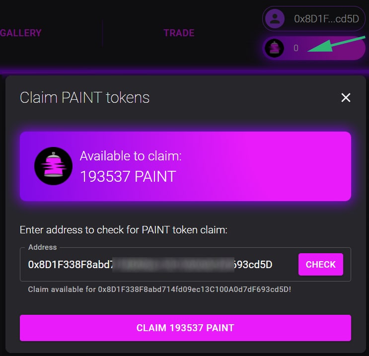Для проверки доступности клэйма перейдите на сайт, нажмите Connect Wallet и увидите справа вверху количество Paint, которые вам причитаются: