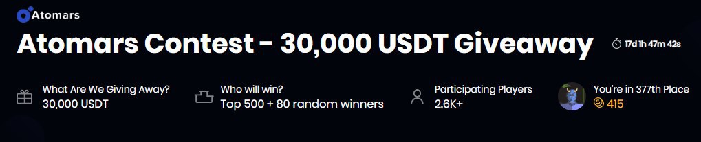 Биржа Atomars раздает 30000 USDT за выполнение заданий по подпискам/лайкам/репостам/приглашение друзей и просто просмотр контента. За все действия начисляются баллы, по количеству которых формируется трейтинг - призы получат ТОП 500 и ещё 80 рандомных участников.