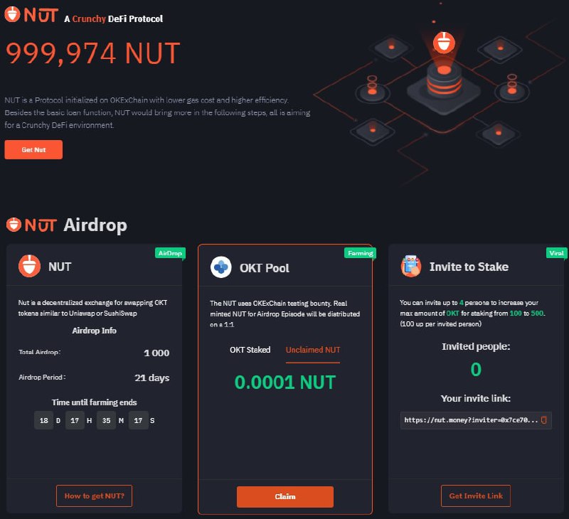 🌰 NUT Money: тестнет + аирдроп #возможноскам Очередной аирдроп в тестовой сети OKExChain🤪 Суть такая же, как была у Lemond - застейкать OKT, чтобы фармить токены NUT. Нафармленные токены обещают выдать в основной сети OKExChain в соотношении 1:1. Пул…