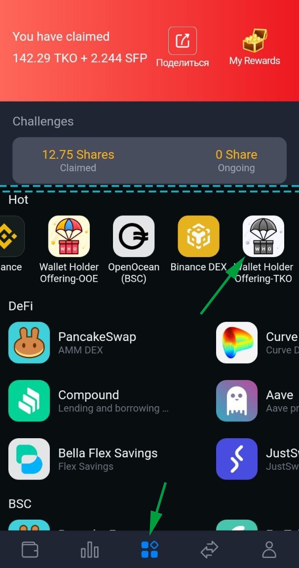✔️пролистайте строку Hot до иконки Wallet Holder Offering-TKO и нажмите ее