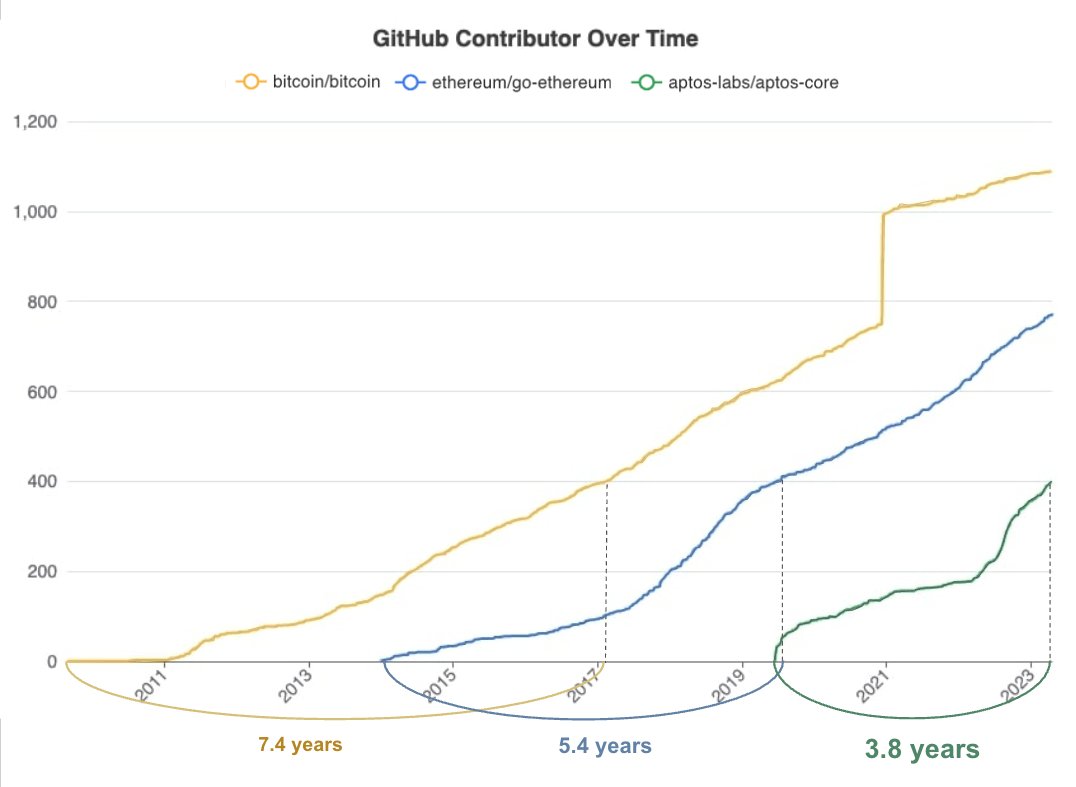 🛠 GitHub показали время, которое различные блокчейны затрачивали на переход от 0 до 400 разработчиков: