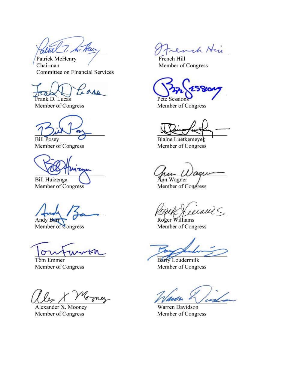 ✍️ Подписи всех республиканцев во главе с председателем Комитета по финансовым услугам Патриком МакГенри под письмом председателю SEC Гэри Генслеру