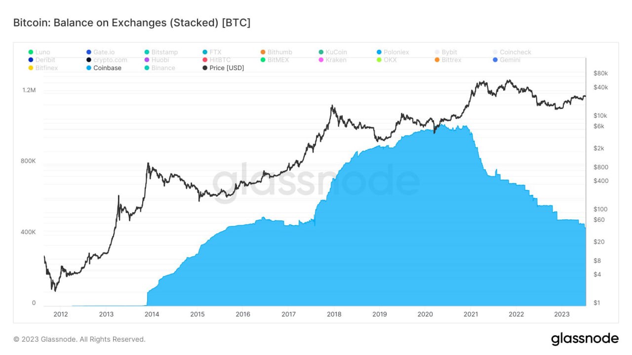 Например, запасы BTC на бирже Coinbase опустились до 439 000 монет (на пике этот показатель составлял 1 млн BTC)