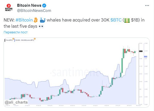 🐳 Биткоин-киты приобрели более 30 тысяч BTC ($1 млрд) за последние пять дней 👀