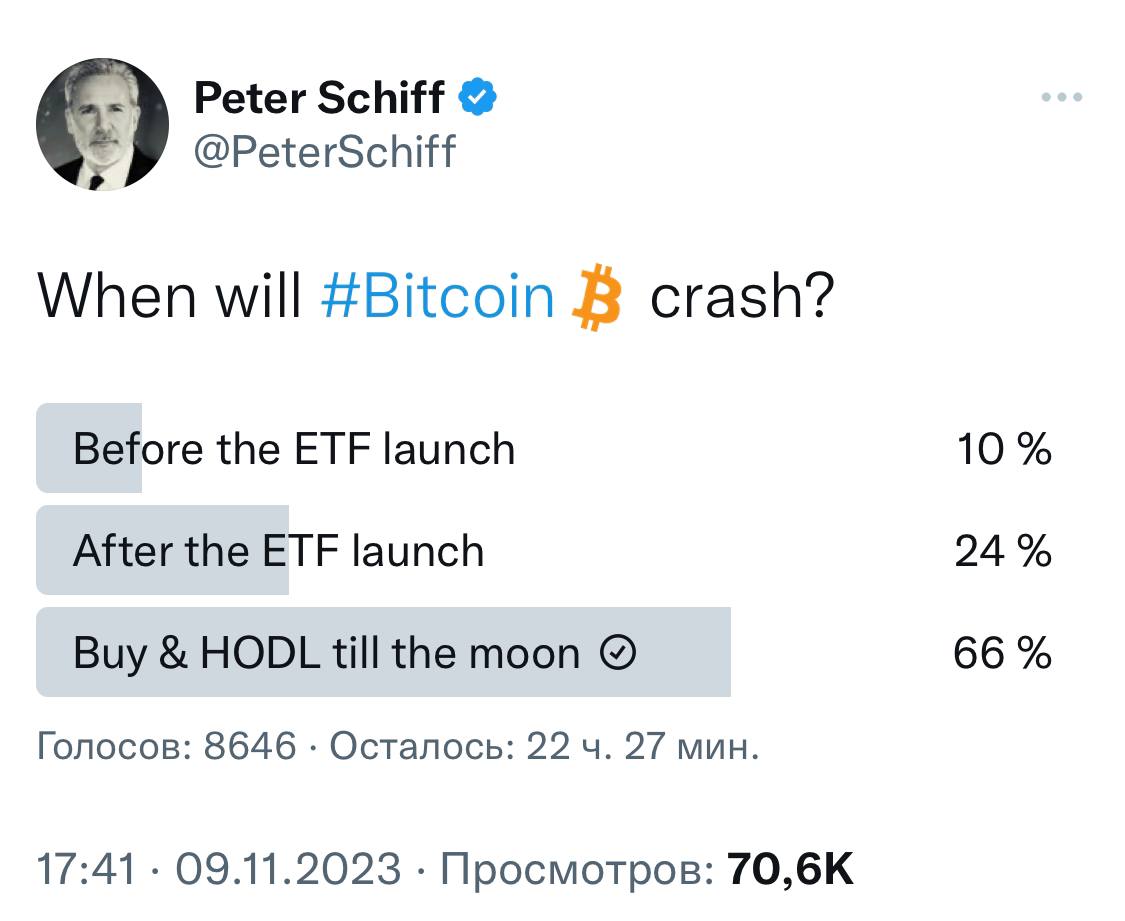 😃 66% подписчиков биткоин-хейтера Питера Шиффа в его опросе «Когда упадет биткоин: ДО или ПОСЛЕ принятия ETF?” выбрали вариант «Купить и ходлить, пока не наступит туземун!»