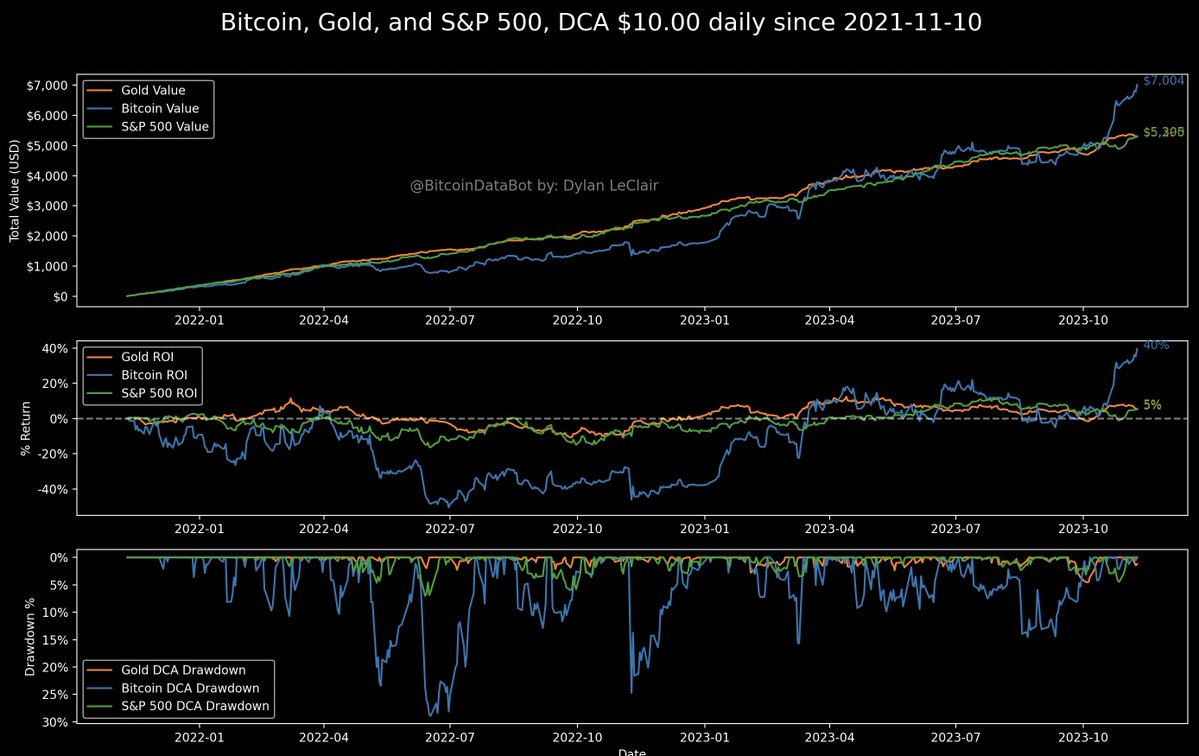 💰Если бы вы начали покупать биткоин, золото и индекс S&P500 по стратегии DCA (по $10 в день независимо от текущей цены) с момента последнего АТН биткоина (10 ноября 2021 года), то сегодня состояние вашего портфеля было бы следующим: