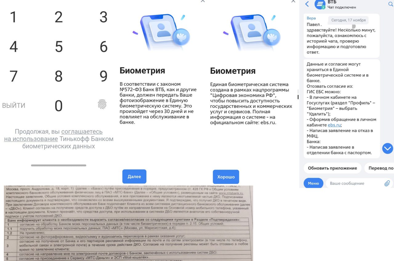 Клиентам ВТБ же в один день после входа всплывает ультимативное уведомление о передаче данные в течение 30 дней. Никакого отказа по кнопке не предусмотрено. Оператор в чате предлагает лишь 4 пути отзыва: в отделении, в МФЦ, на Госуслугах и в ЕБС. В последних двух случаях надо понимать, что уже после передачи слепка.