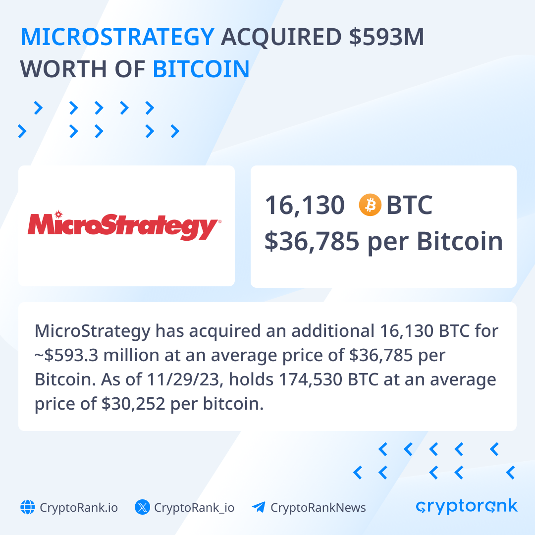 MicroStrategy has acquired an additional 16,130 BTC for ~$593.3 million at an average price of $36,785 per Bitcoin. As of 11/29/23, holds 174,530 BTC at an average price of $30,252 per bitcoin.