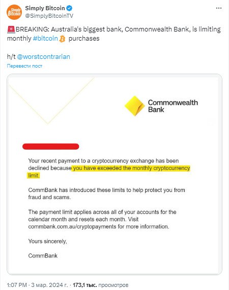 Крупнейший банк Австралии, Commonwealth Bank, лимитирует размер месячных покупок криптовалют для своих клиентов