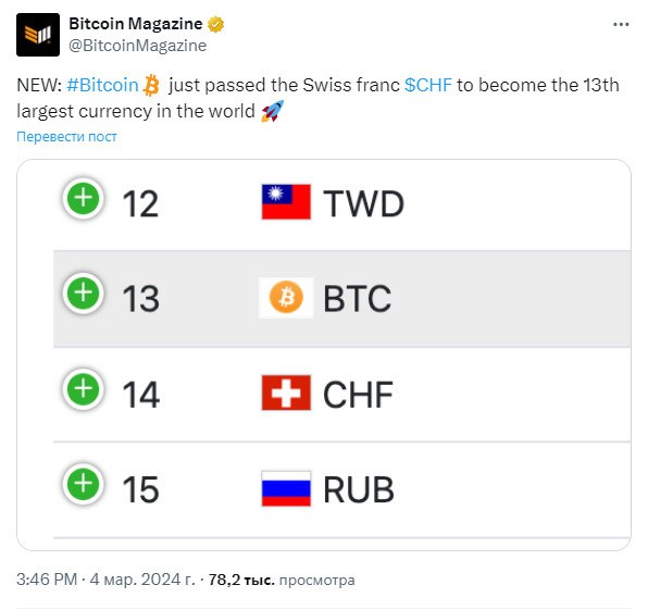 📊Bitcoin обогнал швейцарский франк CHF и стал 13-й по величине валютой в мире 🚀