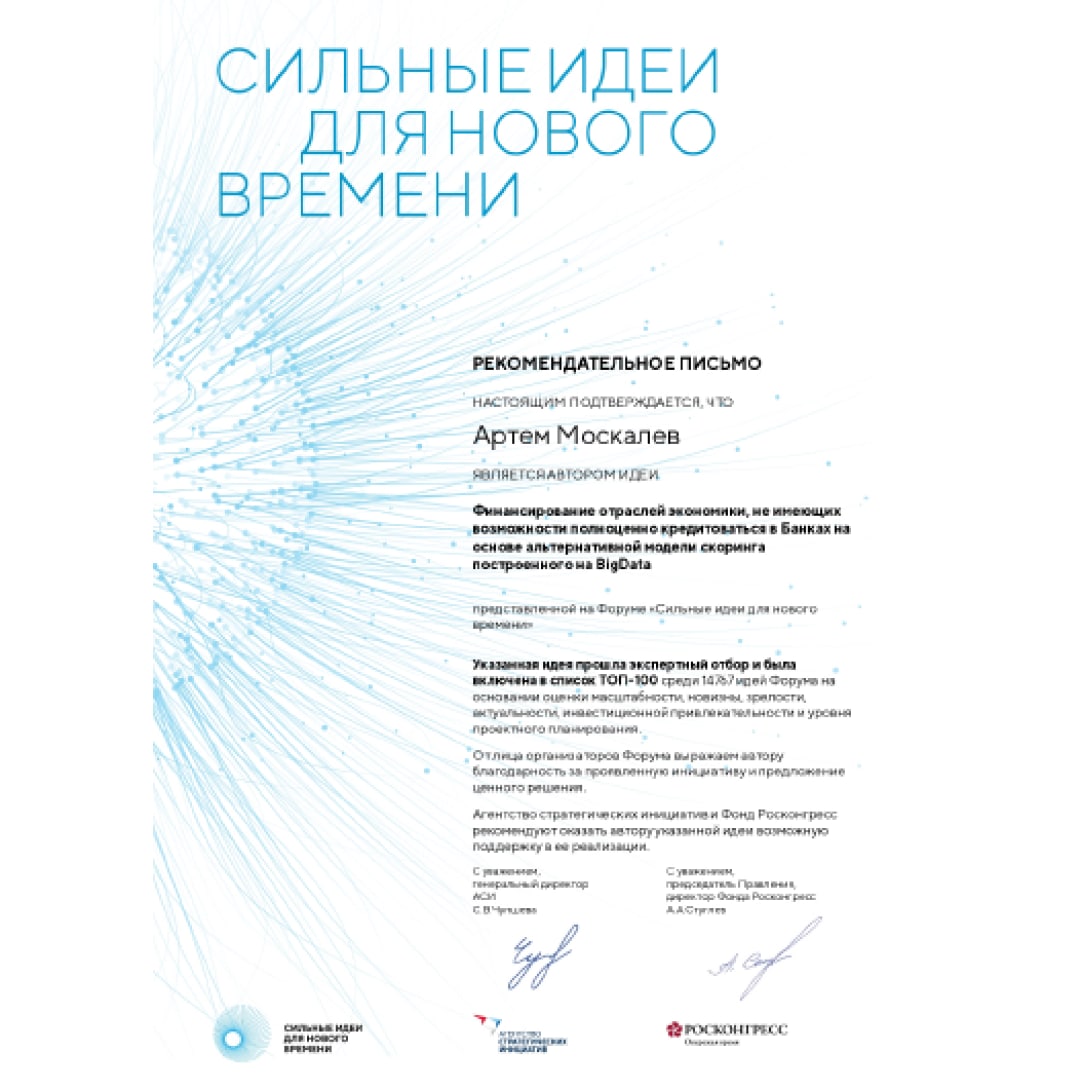 Идея финансирования отраслей экономики, не имеющих возможности полноценно кредитоваться в банках на основе альтернативной модели скоринга, построенной на BigData прошла экспертный отбор и была включена список топ-100 среди 14767 идей форума.
