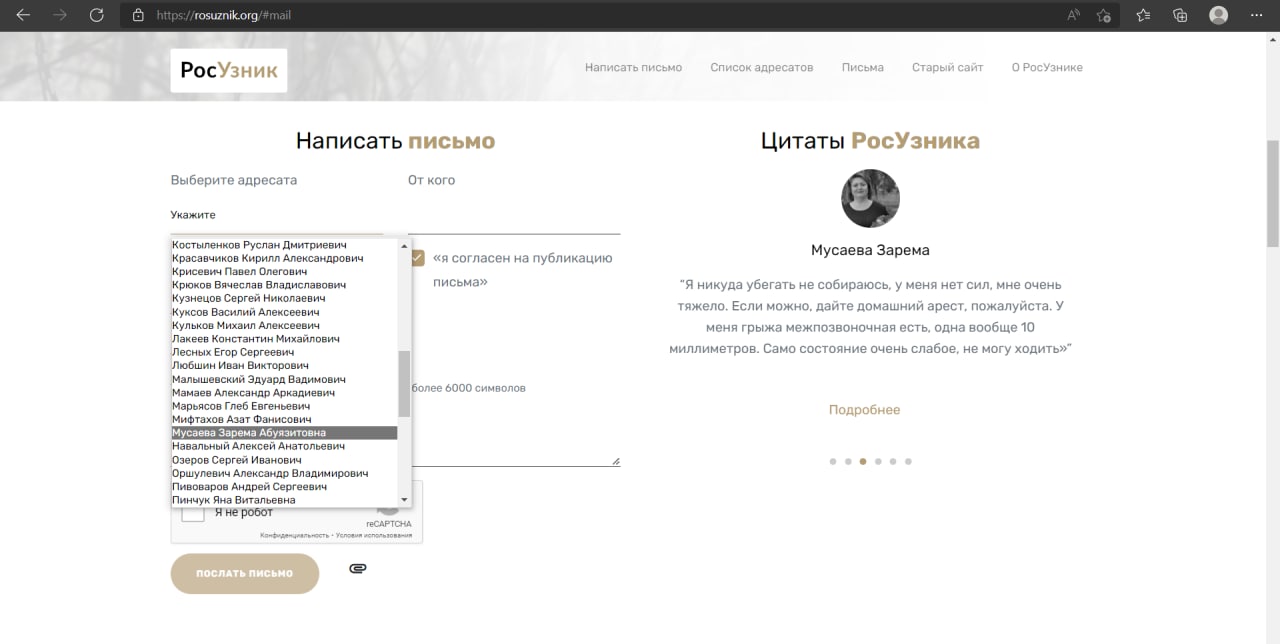 «РосУзник». Это волонтерский проект, который помогает писать политзаключенным. Ребята сами отправляют письма через ФСИНовский сервис. По сути, посредники. Делают это за счет пожертвований.