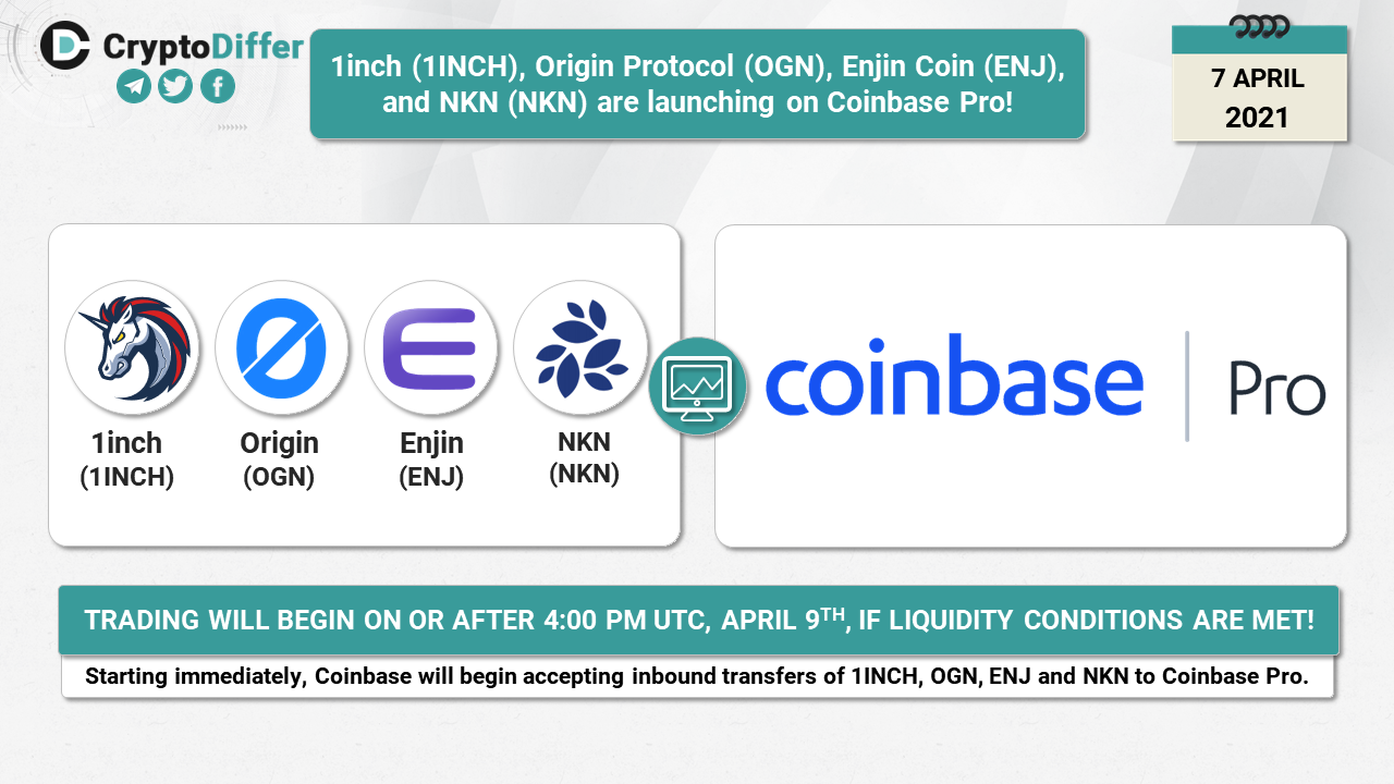 Starting immediately, Coinbase will begin accepting inbound transfers of 1INCH, OGN, ENJ & NKN to Coinbase Pro. Trading will begin on or after 4:00 PM UTC, April 9, if liquidity conditions are met!