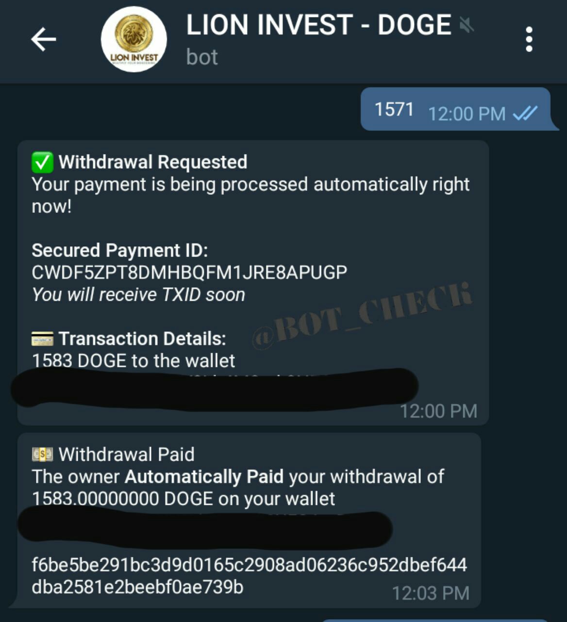 📁 Nᴀᴍᴇ: LION INVEST DOGE 📎 Lɪɴᴋ: LION INVEST DOGE 📊 Pʟᴀɴ:150% within 48 Hrs (main deposit + 50% Profit) 🕘 Pʟᴀɴ Dᴜʀᴀᴛɪᴏɴ: 48 Hrs ➕ Mɪɴ Iɴᴠᴇsᴛ: 10 Doge ➖ Mɪɴ Wɪᴛʜᴅ: 25 Doge ® Rᴇғ Lᴠʟ/Bᴏɴᴜs: 6%, 3%, 2% 🔰 Tʏᴘᴇ: Investment Bot ⁉️ Sᴛᴀᴛᴜs: Paying 💲 Pᴀʏᴍᴇɴᴛ: Automatic…