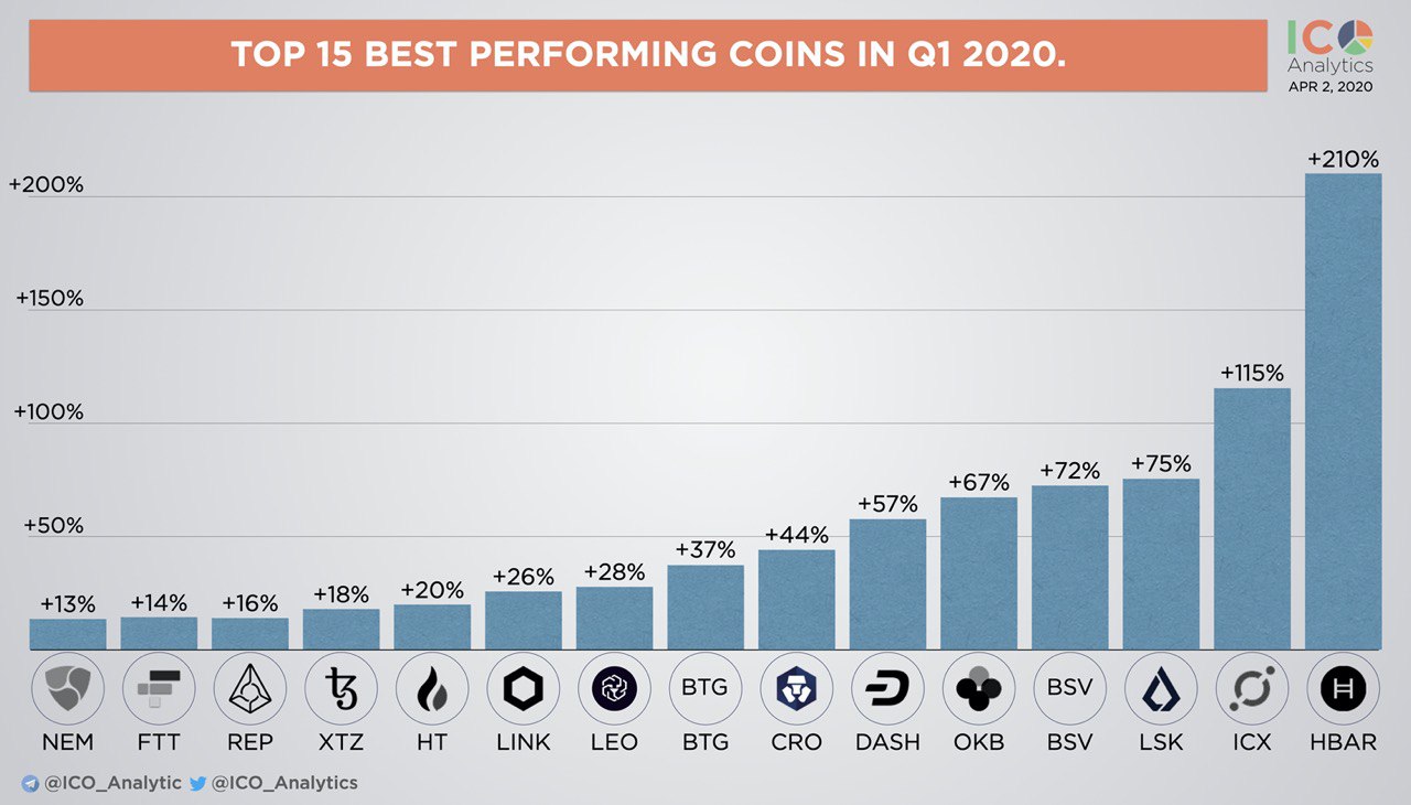 TOP 15 best performing crypto assets in Q1 2020. The assets with market cap $100M+ USD are included in this cart.