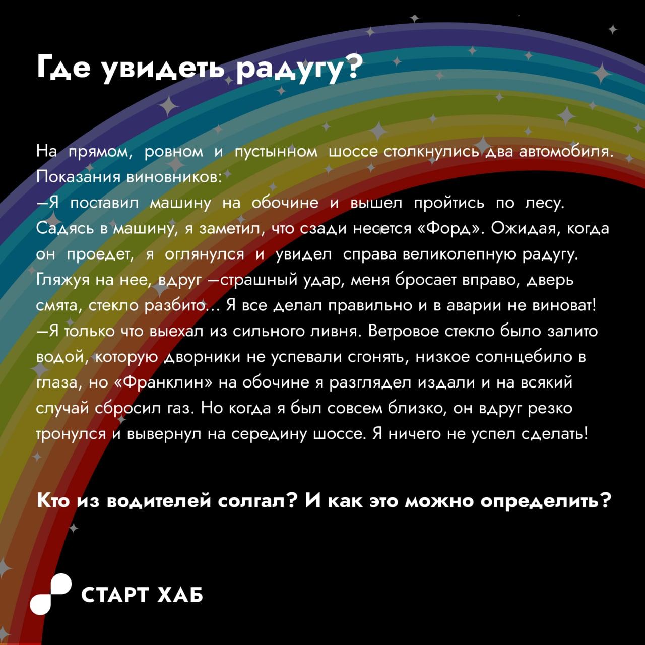 – Я поставил машину на обочине и вышел пройтись по лесу. Когда вернулся, уже темнело. Садясь в машину, я заметил, что сзади несется «Форд». Ожидая, когда он проедет, я оглянулся и увидел справа великолепную радугу. Гляжу я на нее, вдруг – страшный удар, меня бросает вправо, дверь смята, стекло разбито... Я все делал правильно и в аварии не виноват!