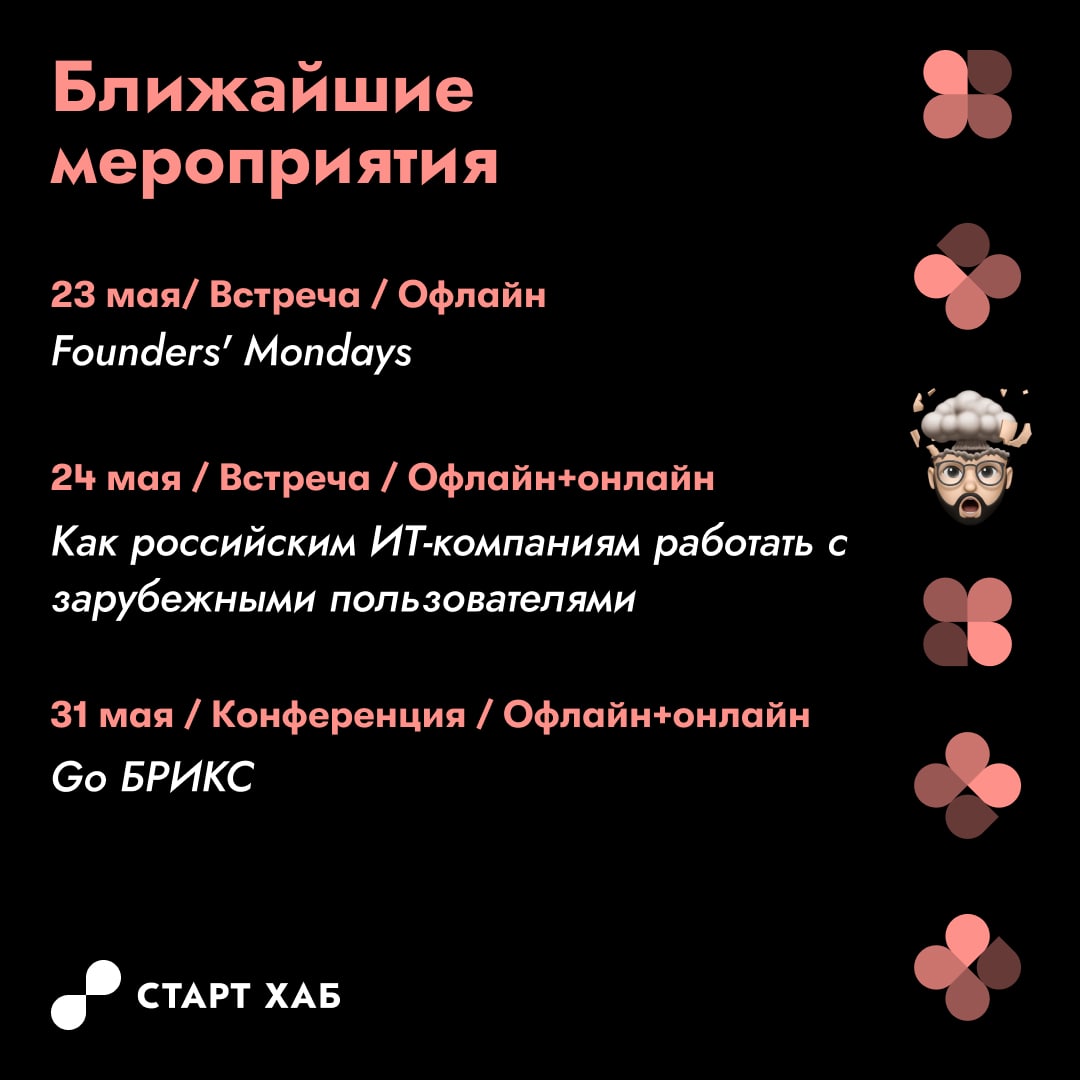 🔹23 мая. Встреча Founders' Mondays. RB.RU совместно со Старт Хаб организует очередную встречу проекта Founders’ Mondays для начинающих предпринимателей и опытных фаундеров. На каждой встрече вы сможете послушать 5-6 питчей, получить обратную связь и просто хорошо провести время с предпринимателями, которые будут говорить с вами на одном языке. Из-за камерного формата встречи количество мест ограничено!