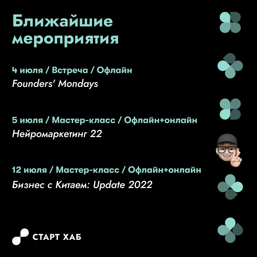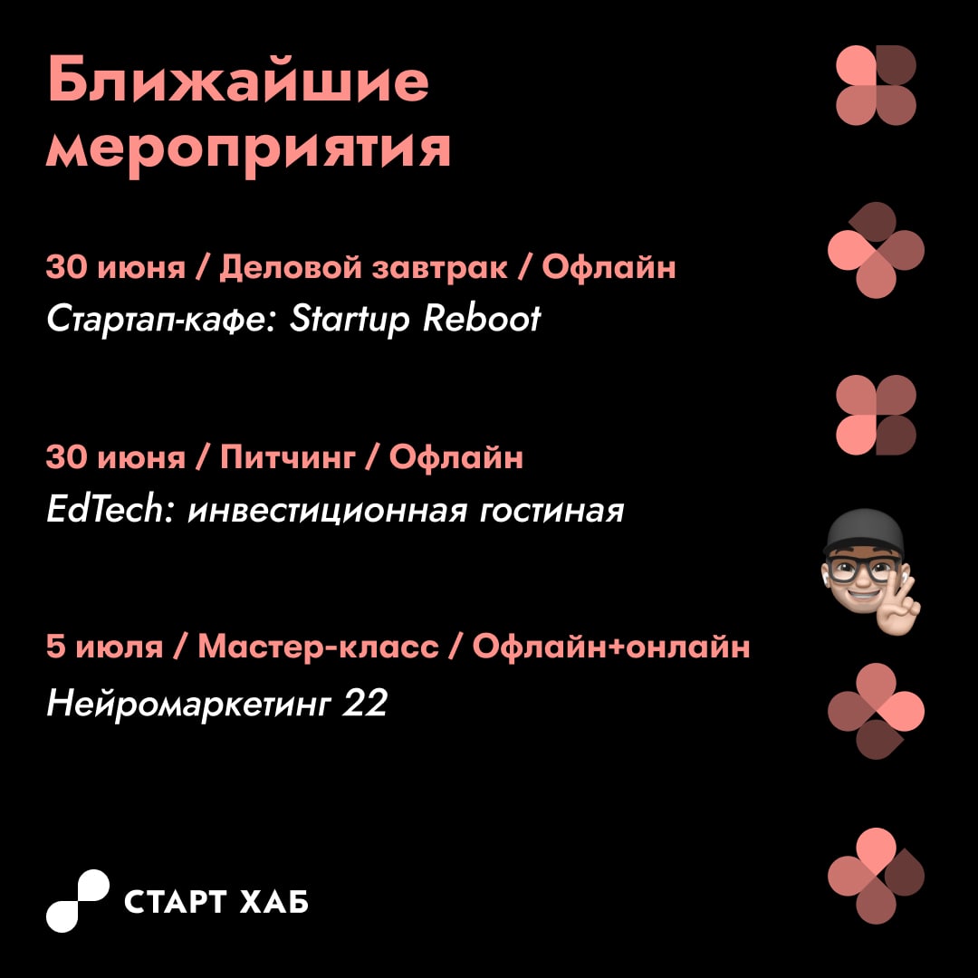 Вечер воскресенья —самое время планировать рабочую неделю. Вам в помощь дайджест мероприятий Технохаба Старт Хаб. Изучайте, выбирайте, регистрируйтесь и не пропускайте. Кстати, на наших мероприятиях всегда комфортная температура несмотря на жару за окном😉