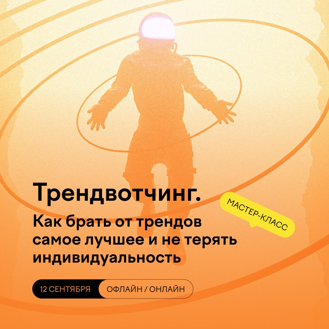 12 сентября приглашаем на мастер-класс «Трендвотчинг. Как брать от трендов самое лучшее и не терять индивидуальность». Рассмотрим роль трендов в общей картине мира, поговорим о том, что такое трендвотчинг и как работать с этой практикой, а также изучим методики поиска и анализа трендов.