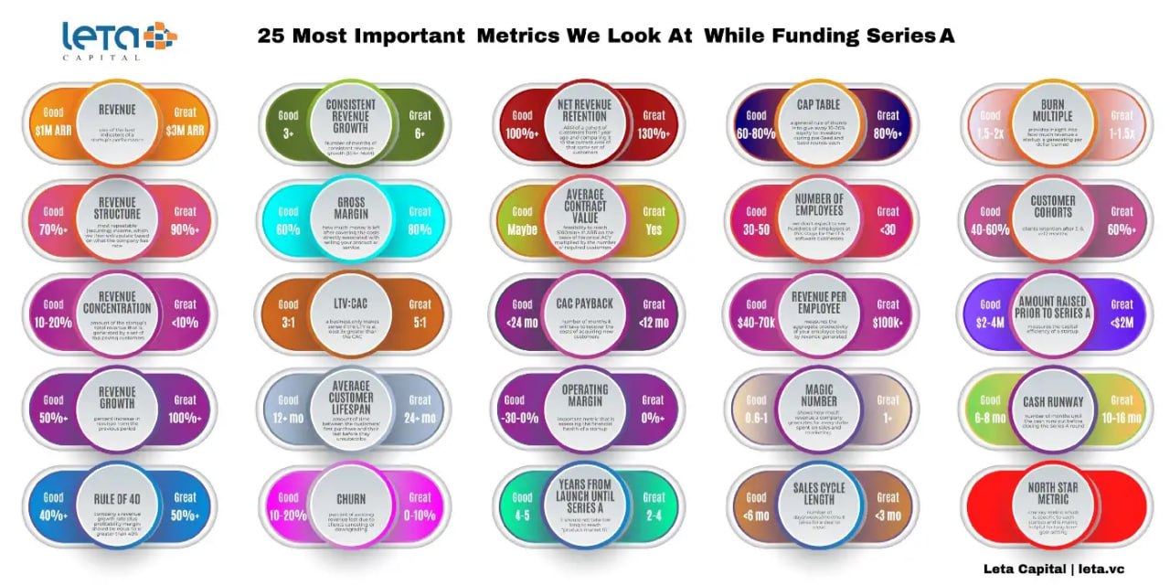 Нашли список от одного венчурного фонда из 25 метрик, на которые они смотрят, когда принимают решение об инвестициях серии A.