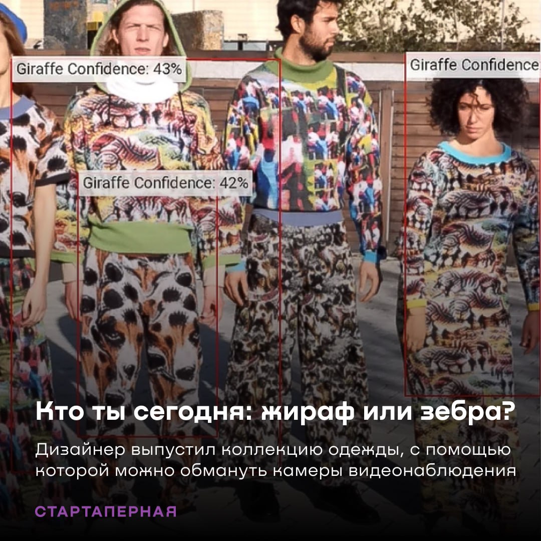 Дизайнер Рэйчеле Дидеро представил одежду с яркими и вычурными узорами, изобилующими деталями. В ней камеры воспринимают человека как зебру, собаку или жирафа. А все потому, что ИИ фиксирует внимание не на лице, а анализирует силуэт и считывает узор на теле.