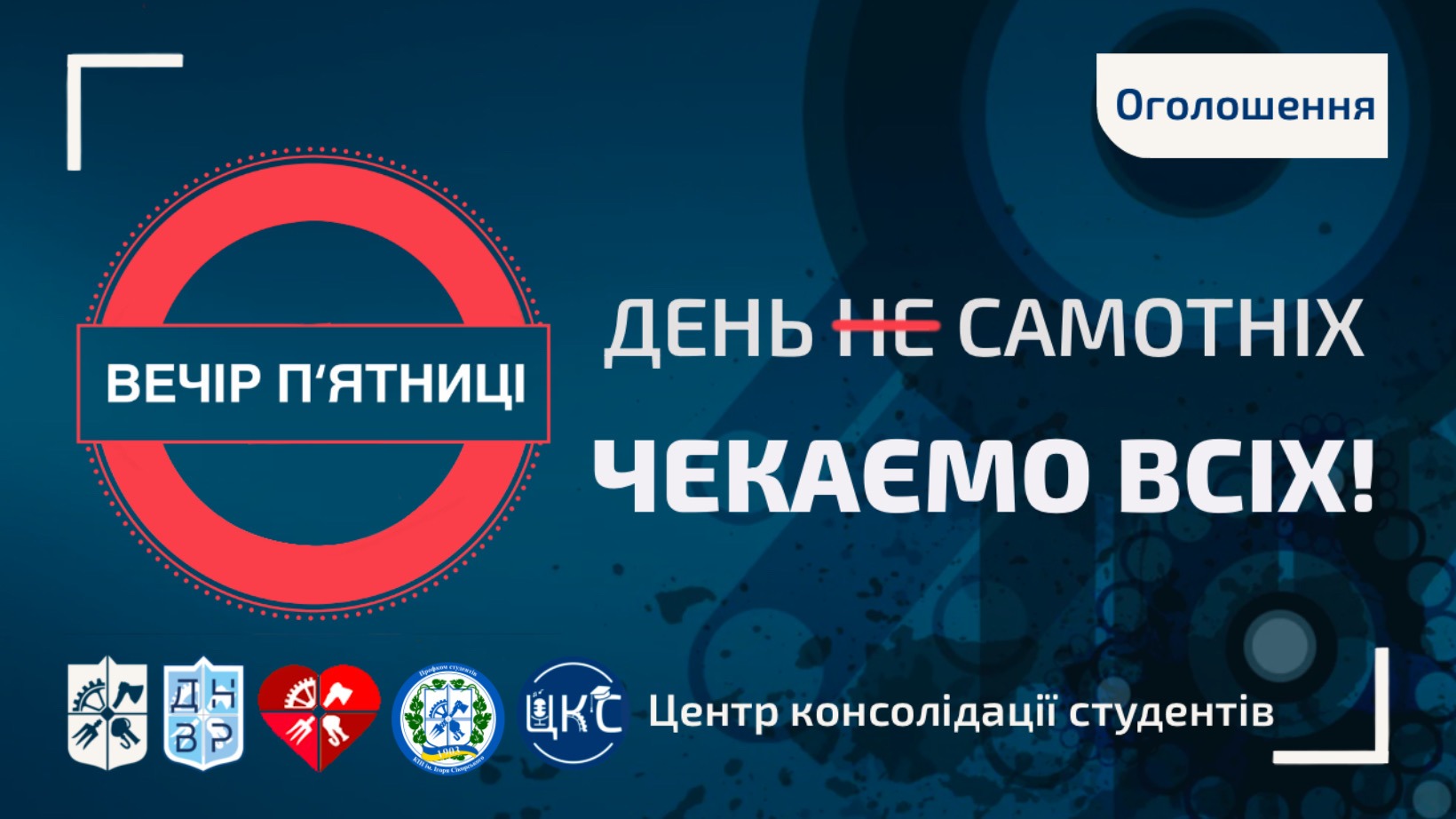 🔸На цей Вечір п‘ятниці ми, разом з Студентською соціальною службою та Профкомом студентів КПІ проведемо щось особливе та досить незвичне. Але для того щоб все вдалося нам потрібно багато людей. Тож, маєш пару ти, чи ні – бери друзів та приєднуйся!