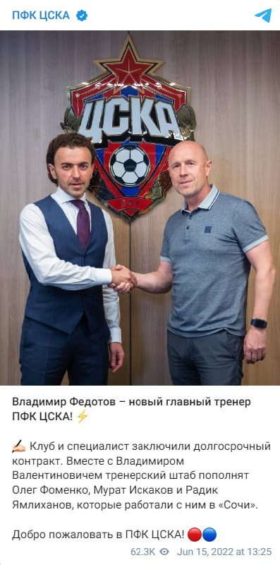 15 июня 2022 года было официально объявлено о назначении Владимира Федотова на пост главного тренера московского ЦСКА.