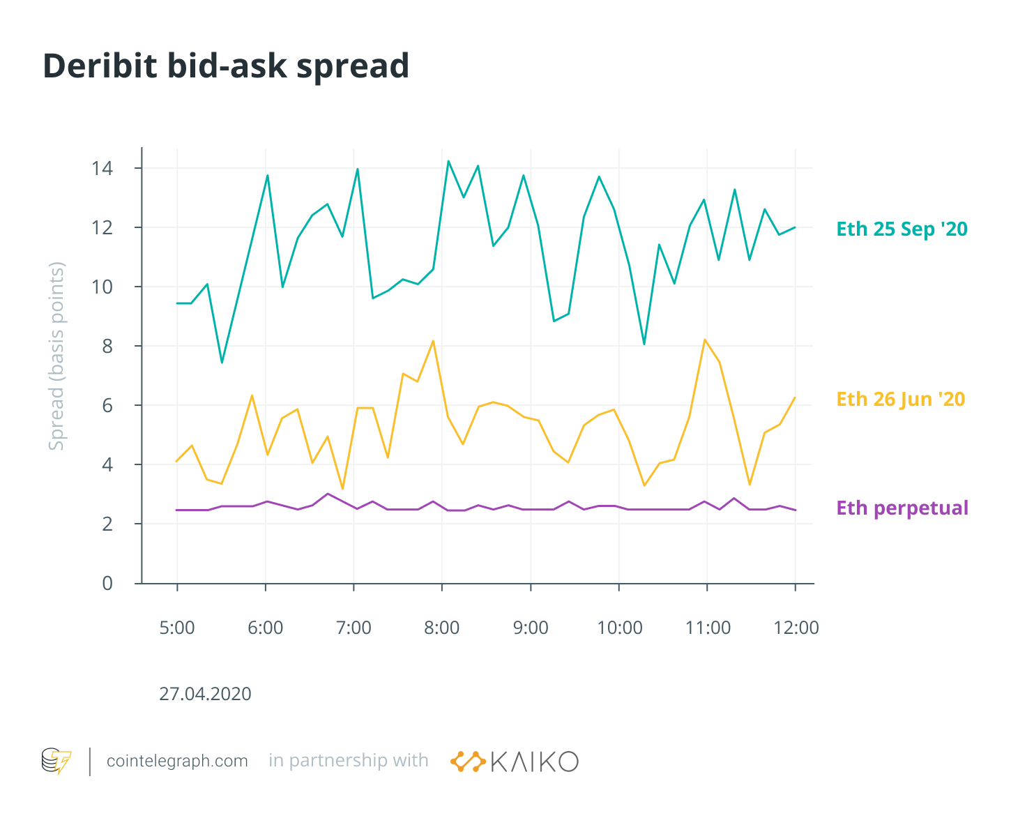 Derivatives markets tend to be more fragmented, with contracts of many expiration dates and strike prices, resulting in a significant number of very low liquid contracts with wide spreads. By charting three Ethereum contracts on Deribit,we show how spreads differ depending on the expiry.