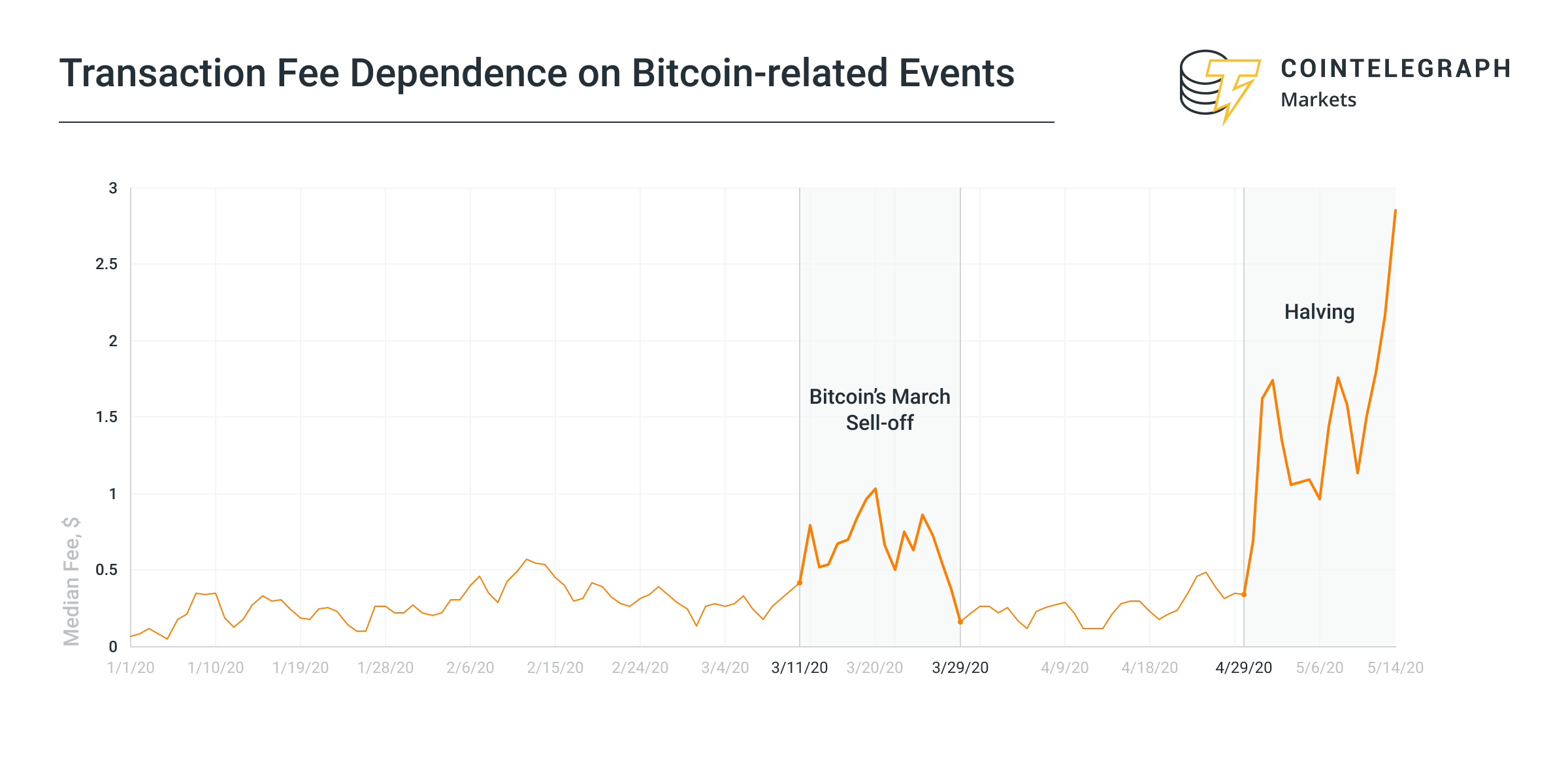 Median BTC transaction fees have shown two significant correlations to Bitcoin events during 2020. As BTC's price rapidly dropped in March, the commission had been on average more than two times higher for the following two weeks relative to the beginning of the year.