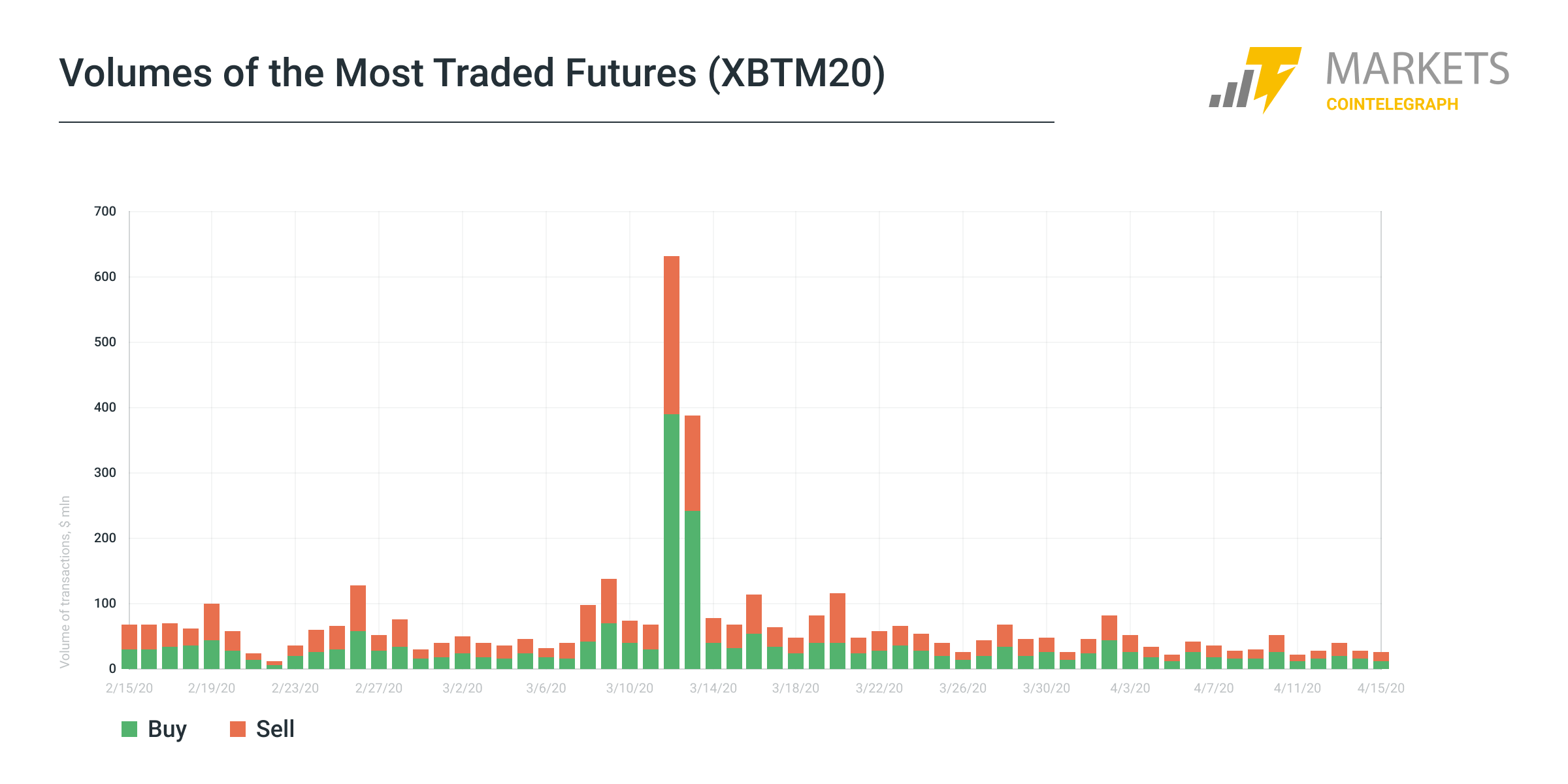 Let’s take a look at how buys and sells have been distributed for the most traded futures in the last two months. The peak is clearly visible on March 12 and 13 when Bitcoin's price fell by 50%.