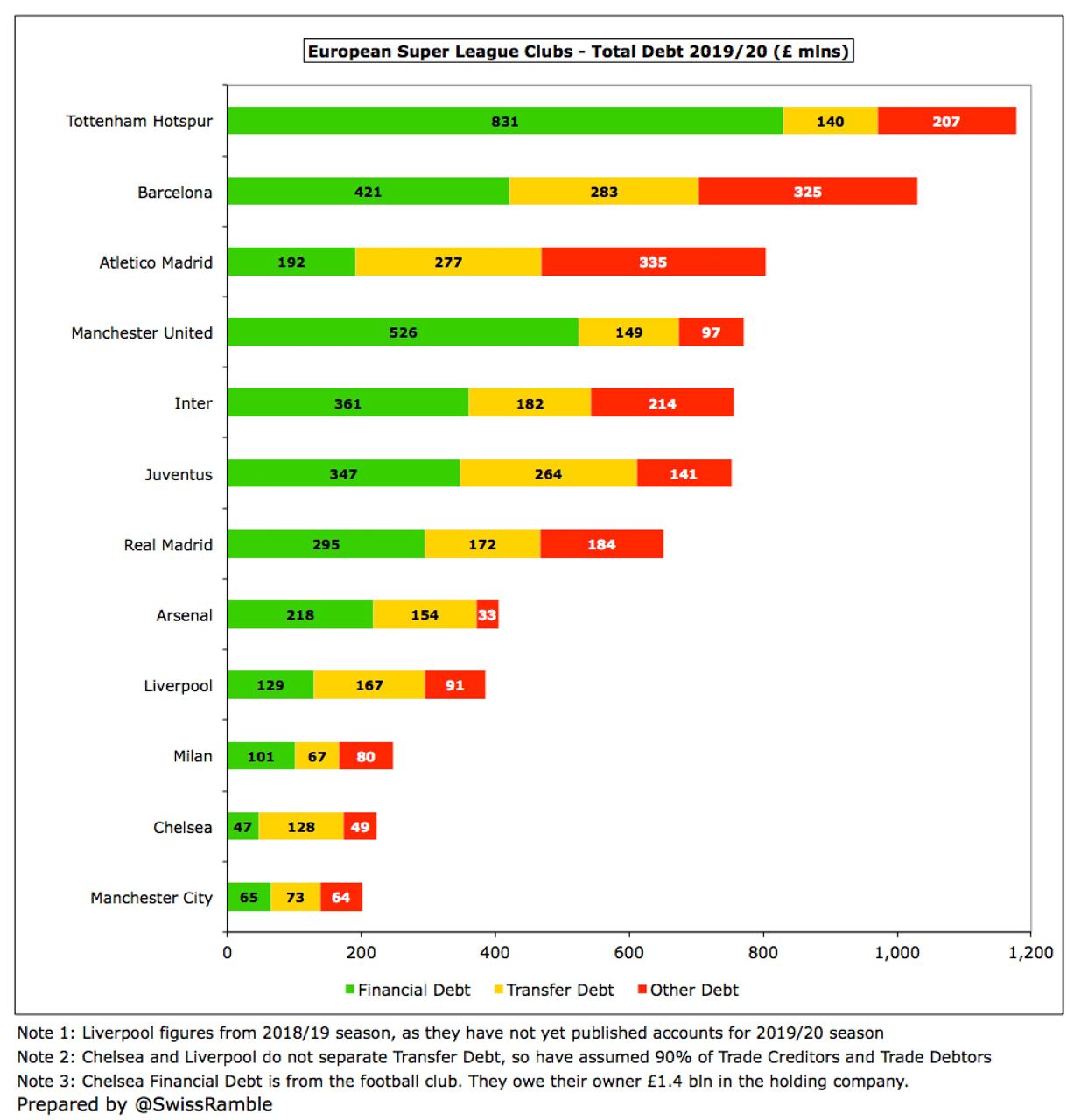 «МЮ» наоборот отперформил в коронавирусное время лучше всех – -13 млн евро, но про долги Глейзеров перед кредиторами известно давно. Смешно, что нынешний главный спонсор Суперлиги банк JP Morgan (готовы вложить 4,6 млрд евро) – бывшее место работы исполнительного директора «МЮ» Эда Вудворда, а еще именно в JP Morgan хранятся деньги «МЮ» и висит долг (около 700 млн евро).