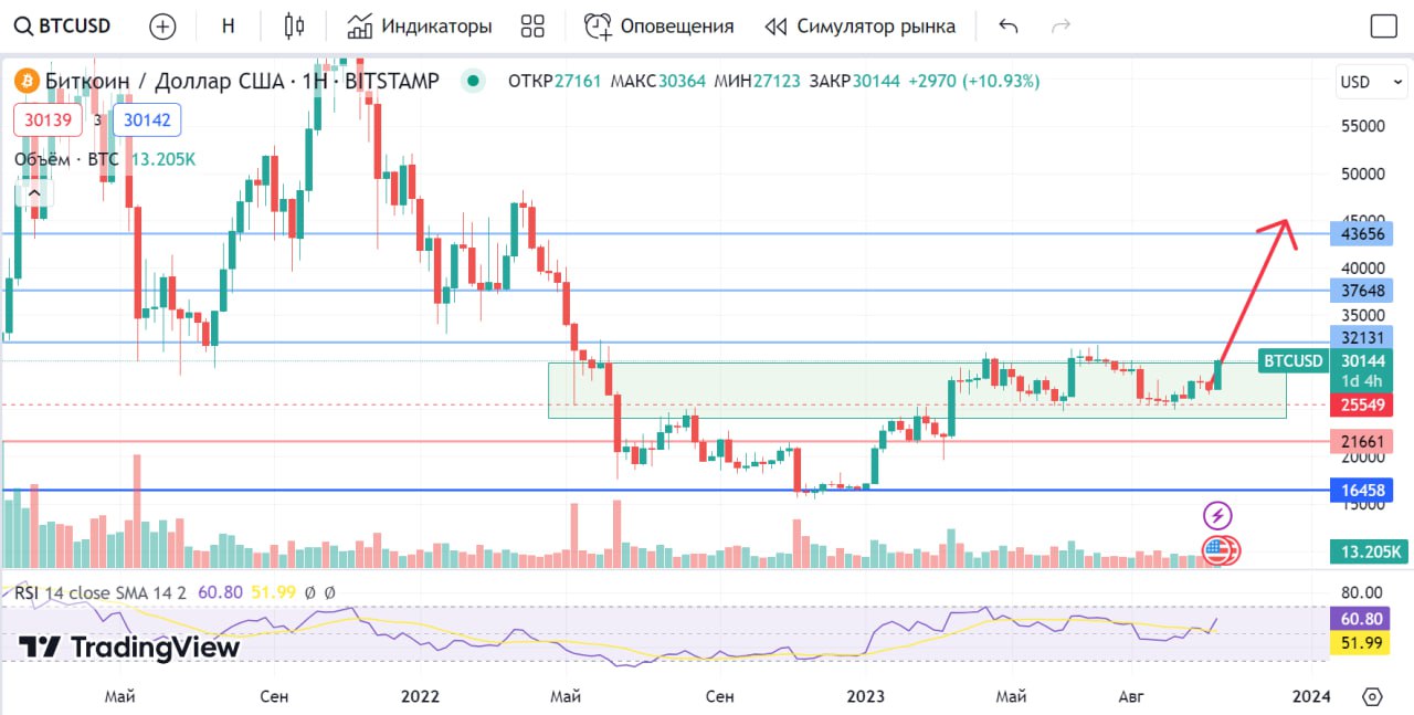 Это стало следствием ряда позитивных новостей и ожиданий по заявкам на запуск спотовых ETF на первую криптовалюту.