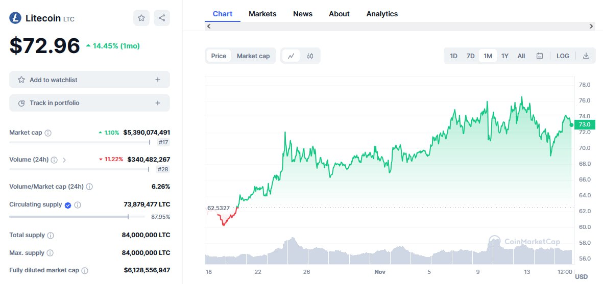 📈Litecoin (LTC) за месяц прибавил лишь 17%, но есть два интересных момента, которые могут помочь монете догнать рынок.