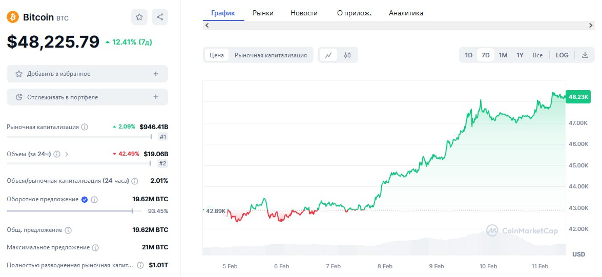 1️⃣ Bitcoin набирает ход. Цена мощным движением превысила отметку 48 тыс.$ за BTC и устремилась на новый локальный максимум, который находится немного выше 49 тыс.$.🚀