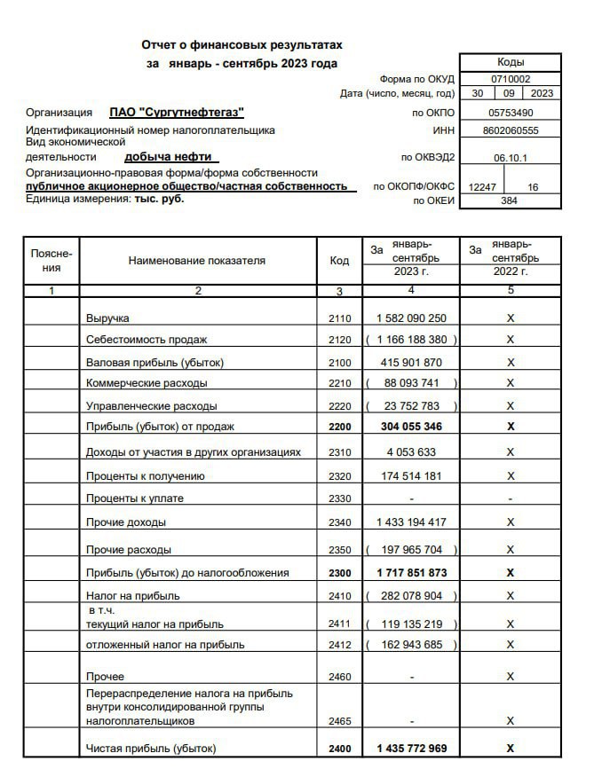 ⚡️ Компания Сургутнефтегаз представила отчёт по российским стандартам за 9 месяцев текущего года, который даёт ориентировочное понимание текущего положения бизнеса компании.