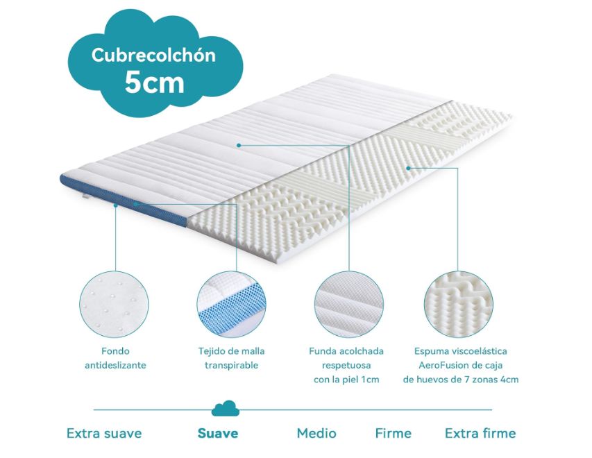 β¨ Topper de colchΓ³n de espuma viscoelΓ‘stica con memoria de 5 cm y funda extraΓble lavable que ayuda a mejorar la comodidad y adaptarse al cuerpo durante el descanso