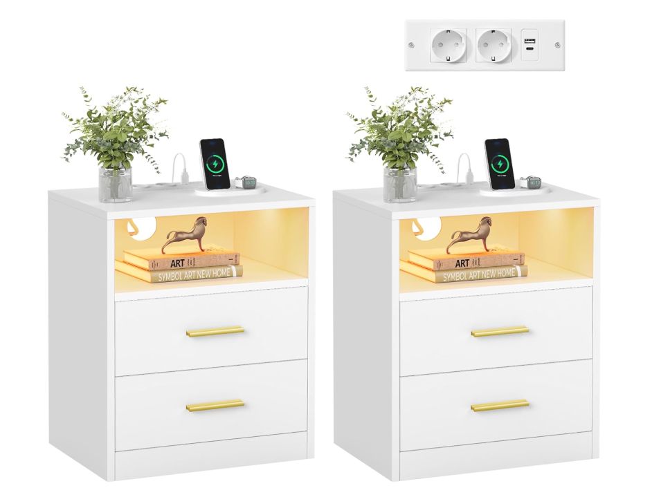 β¨ Pack con 2 mesitas de noche con cajones, estante abierto, estaciΓ³n de carga con 2 tomas CA y puertos USB y luz LED que permiten organizar y cargar dispositivos