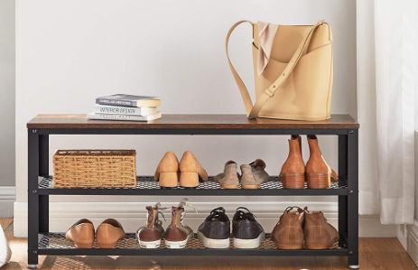 β¨ Mueble con estructura de acero y superficie de madera que combina un asiento resistente con dos estantes de rejilla para organizar el calzado de forma compacta y funcional
