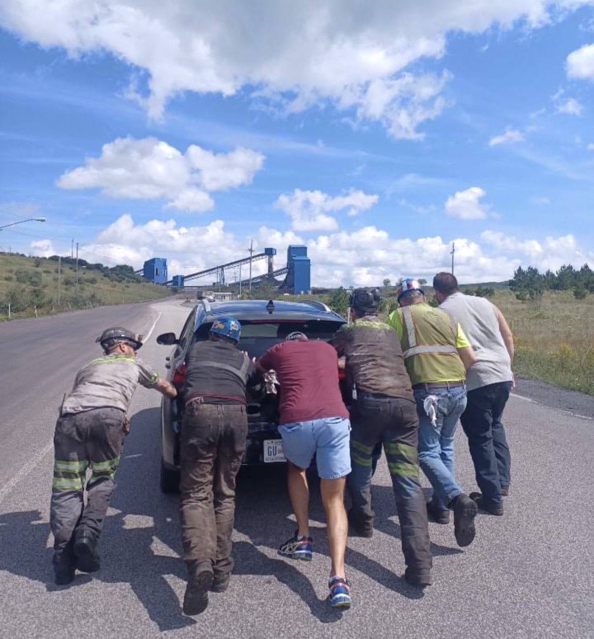 Шахтеры в Западной Вирджинии толкают электромобиль к зарядной станции на угольной шахте после того, как он сдох на дороге.