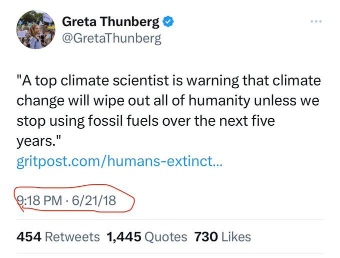 У Греты еще осталось чувство стыда. Она удалила свой твит 5-летней давности с несбывшимся прогнозом гибели человечества через 5 лет.