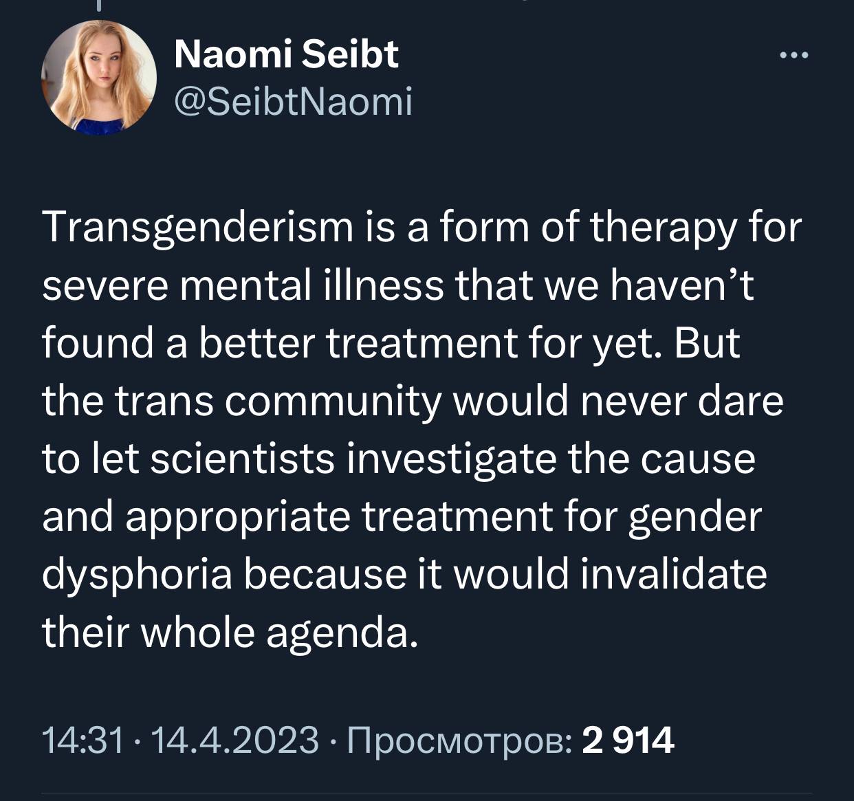 Трансгендеризм - это форма терапии тяжелых психических заболеваний, для которой мы еще не нашли лучшего лечения. Но транс-сообщество никогда не осмелится позволить ученым исследовать причину и надлежащее лечение гендерной дисфории, потому что это сделает недействительной всю их повестку дня.
