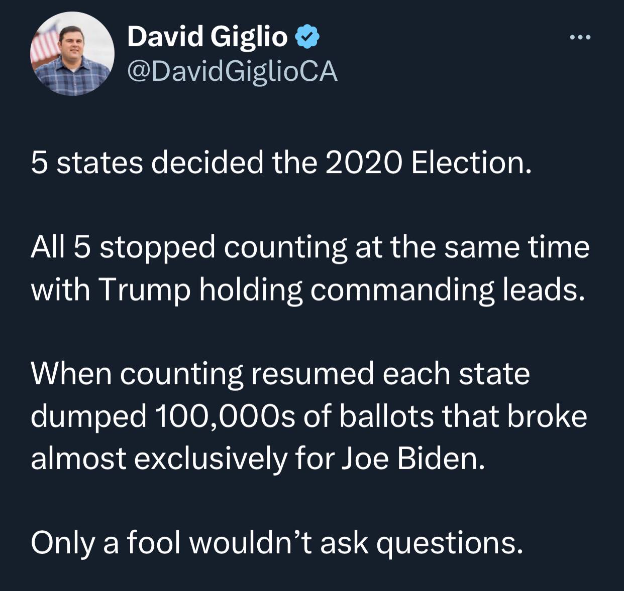 Когда подсчет возобновился, каждый штат вбросил 100 000 бюллетеней, которые оказались почти исключительно за Джо Байдена.