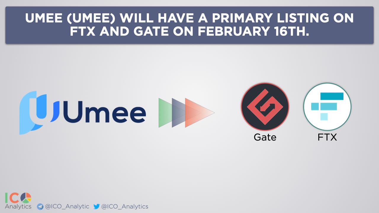 Umee (UMEE) will have a primary listing on FTX and Gate on February 16th. Trading on Gate will start at 01:00 AM (UTC). UMEE/USD trading pair on FTX to go live at 2:00 PM (UTC).
