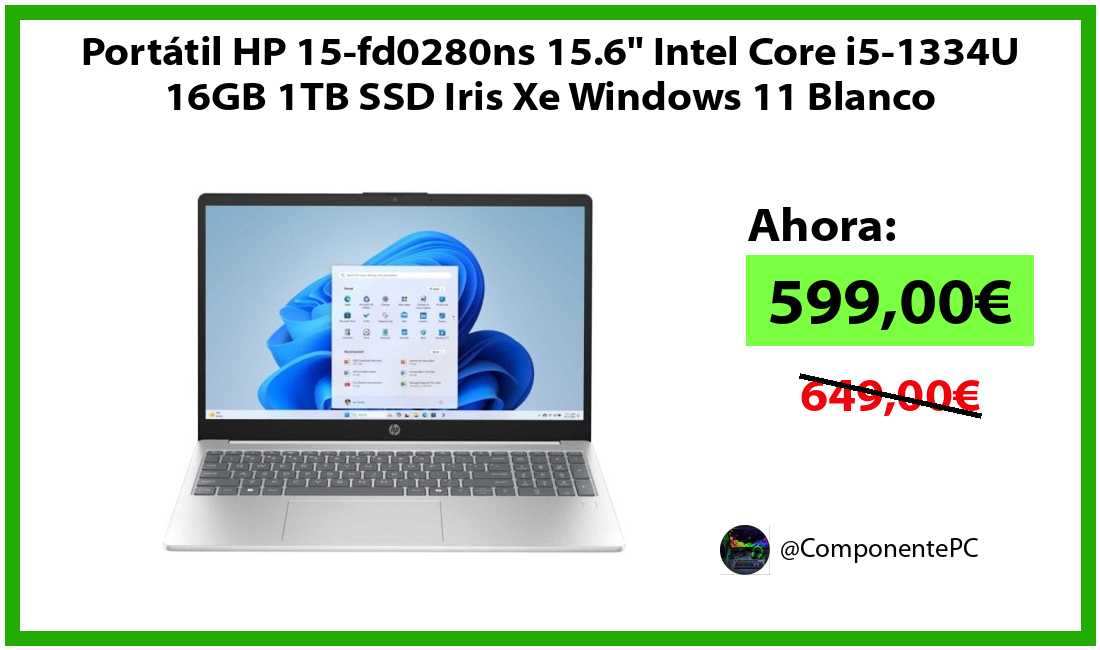 🔹Portátil HP 15-fd0280ns 15.6" Intel Core i5-1334U 16GB 1TB SSD Iris Xe Windows 11 Blanco solo 599,00€❗️⚡️(PVP: 649,00€)