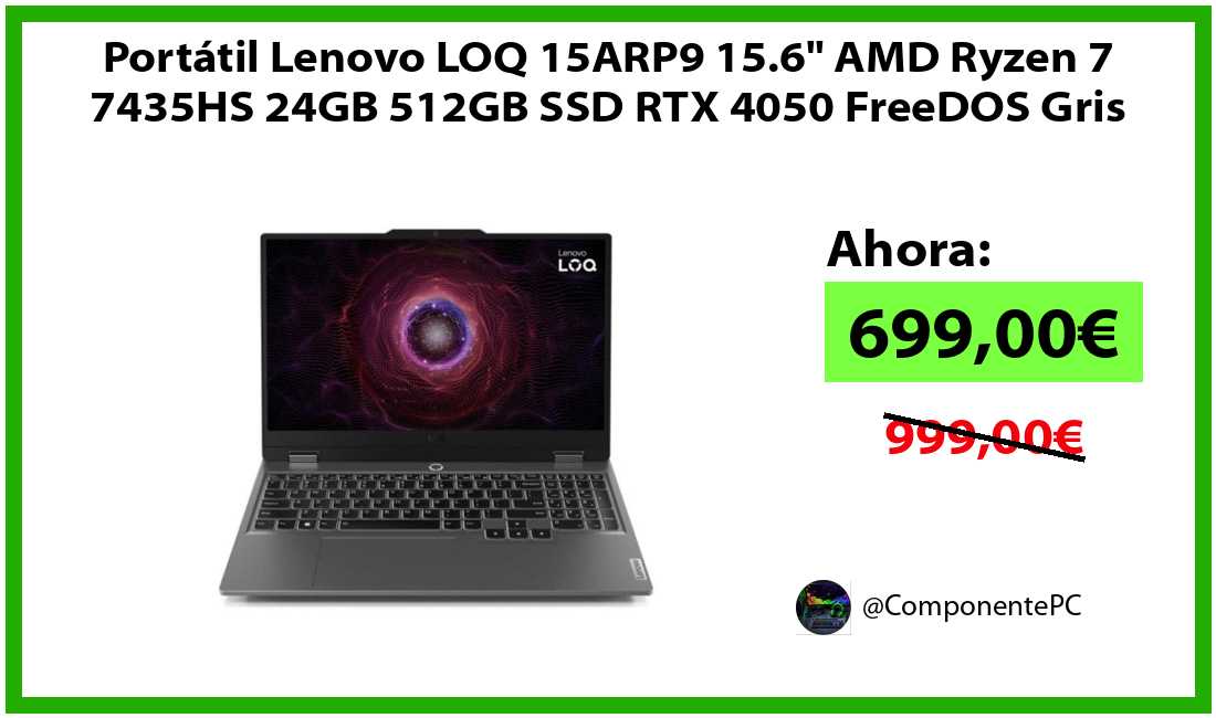 🔹Portátil Lenovo LOQ 15ARP9 15.6" AMD Ryzen 7 7435HS 24GB 512GB SSD RTX 4050 FreeDOS Gris solo 699,00€❗️⚡️(PVP: 999,00€)